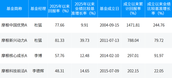 具体来看,摩根资产管理中国旗下多只成立满十年基金无论是短期业绩还是长期业绩,均表现优异。截至2025年11月30日,摩根中国优势A成立21年以来累计回报率1471.81%,同期业绩比较基准增长率244.76%,该基金2025年以来的收益率达77.66%,同期业绩比较基准收益率为9.91%;摩根新兴动力A 成立14年以来累计回报率788.04%,同期业绩比较基准增长率79.72%,2025年以来净值增长率达81.33%,大幅跑赢同期业绩比较基准的39.73%。