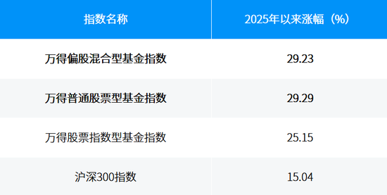 Wind数据显示,截至2025年11月底,万得普通股票型基金指数、万得偏股混合型基金指数年内涨幅明显跑赢沪深300指数,优于万得股票指数型基金指数。2025年之前成立的主动权益类基金(包括万得普通股票型、偏股混合型、灵活配置型和平衡混合型基金,仅统计初始基金份额)2025年以来平均收益率达27.52%,收益率中位数为24.25%。