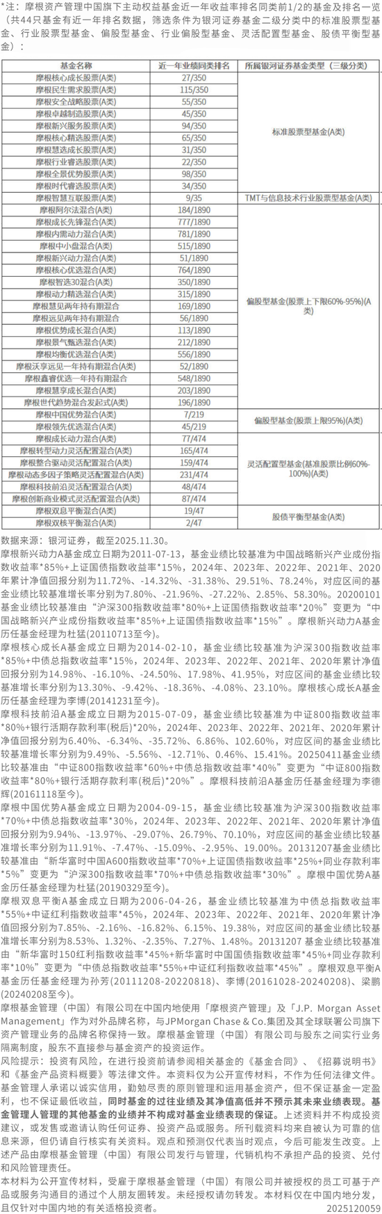 资料来源:银河证券,数据截至2025.11.30,近1、2、3、20年评价开始日期参评基金数量分别为52、49、49、1只,评价截止日期参评基金数量均为54只,按照规模平均口径计算,近1、2、3、20年管理人年化股票投资主动管理收益率为50.28%、26.70%、10.56%、13.50%,获评实体为摩根基金管理(中国)有限公司。